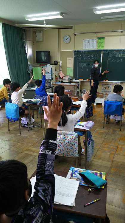 [4年生算数]「横の本数が多くなると縦の本数は少なくなる。縦の本数と横の本数を足すと9になる。」これを記号で「○+△=9、9−○=△」と表しました。