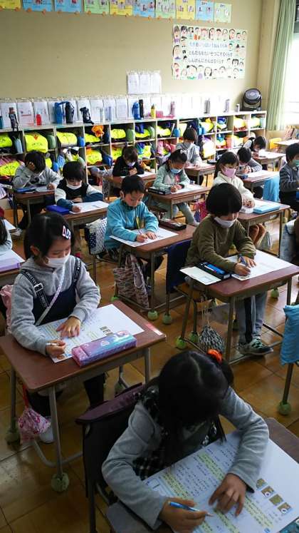 [1年生国語]みんな真剣に先生の話を聞きました。さあ、テストを表にして問題を解き始めます。お話の内容を思い出しながら解答します。