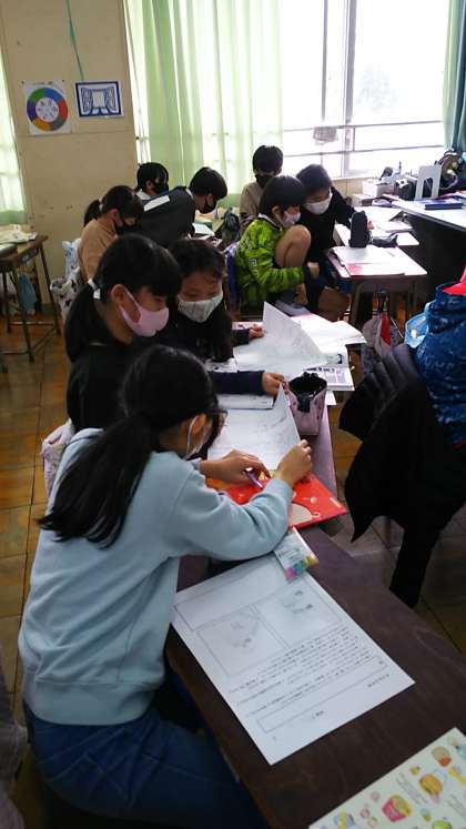 [5年生国語]お隣同士、交流しながら考えを共有していきます。ストーリーは担任の先生のオリジナル脚本です。どの場面を取り上げるのかは自由です。