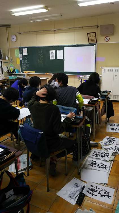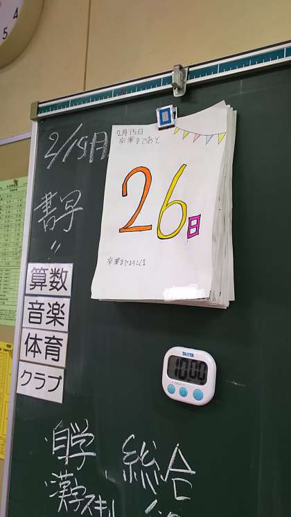 [6年生国語(書写)]今週は土曜日も午前授業がありますので、いつもより少し長い一週間です。黒板には「卒業まであと26日」の文字が貼られています。もうそれしかないのですね。時間って速いなあと感じます。