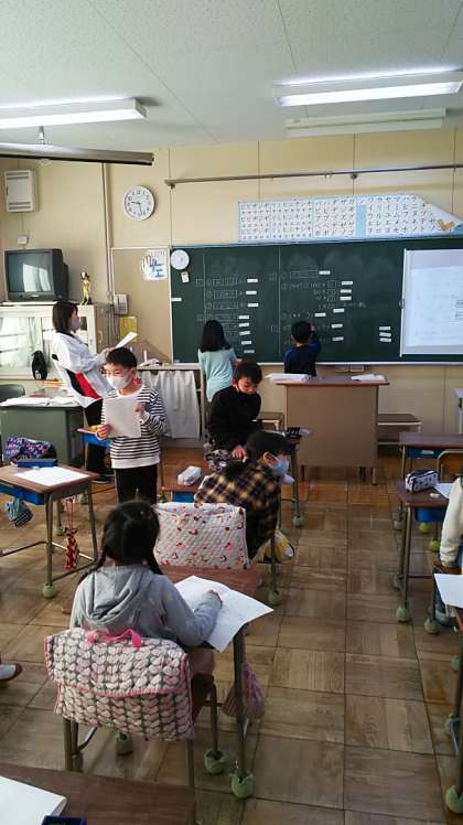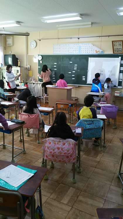 [2年生算数]「1000をこえる数」のプリントをやりました。さあこれから答え合わせです。順番に黒板の解答欄に答えを書いていきます。