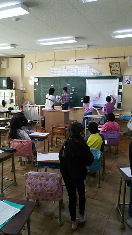 [2年生算数]子供たちにとって黒板に答えを書くことはドキドキすることなのかなと思います。みんな合ってるといいね。でも間違えても大丈夫ですよ。教室はどんどん間違えていいところだからね。