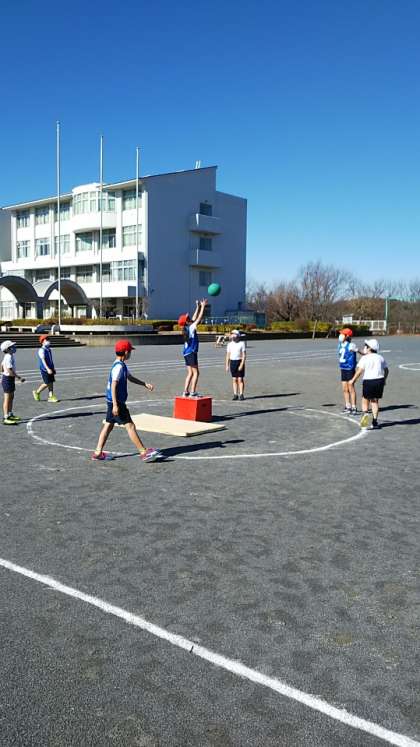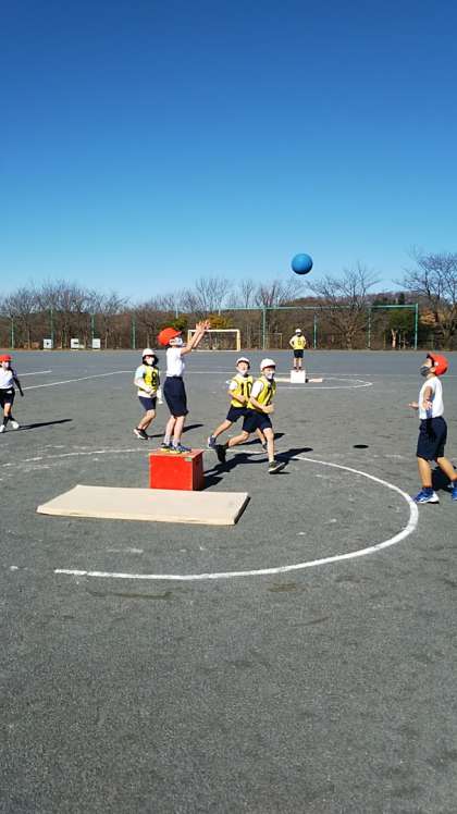 [4年生体育]4年生は校庭でボールゲームをしていました。ポートボールです。ルールはオリジナルを加えているそうです。