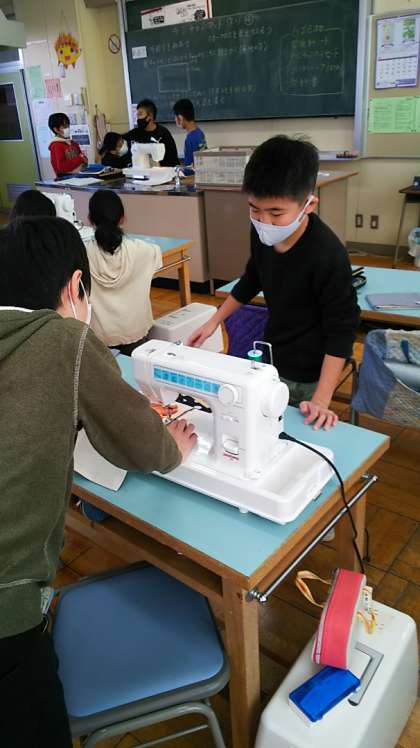[5年生家庭]みんな真剣に針先を見つめながらミシンを操作しています。手作りした物は、買ってきた物とはまた違った愛着が湧きますよね。