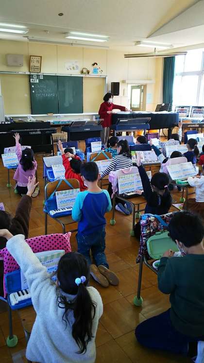 [1年生音楽]音楽室で距離をとりながら学習しています。鍵盤の練習ですが、一斉に吹くことはしません。