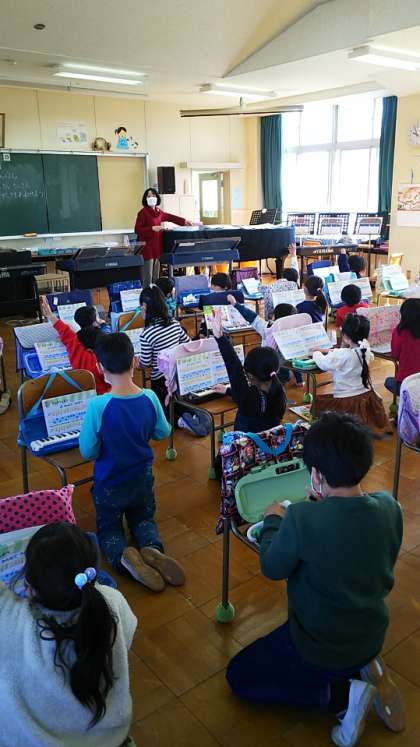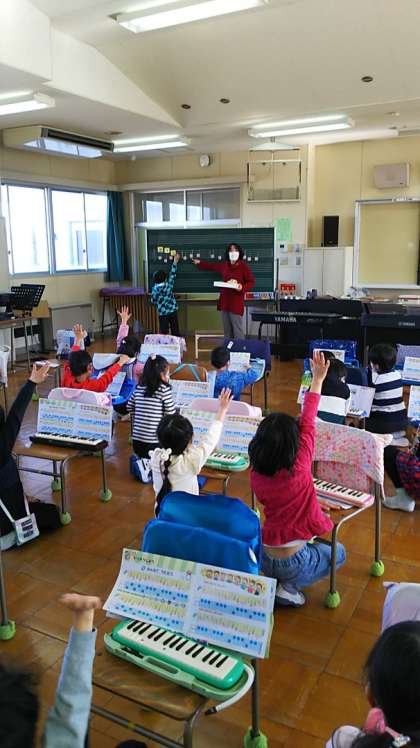 [1年生音楽]音階(ドレミ)ごとに使う指をしっかりと番号で覚えていきます。すべてひとつの指で弾くようにしないためです。親指は1、人差し指は2です。「3は?」の問いに、「お兄さん指!」と答える子供たちがかわいらしかったです。