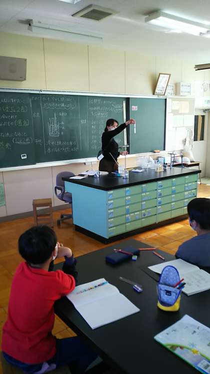 [4年生理科]氷水と食塩を入れたビーカーに水を入れた試験管を差し込むと、水温は次第に下がっていきます。