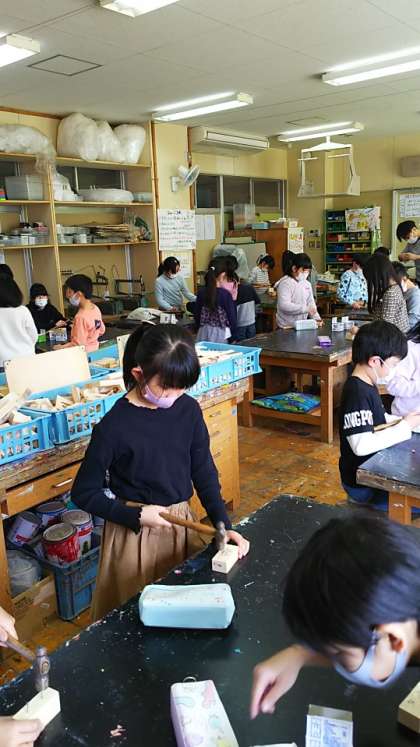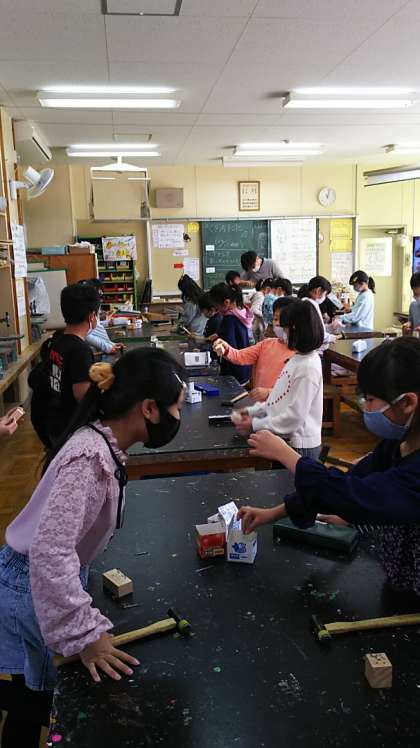 [3年生図工]「くぎうちトントン」です。金づちでくぎを打って楽しいものを作ります。まずはくぎ打ちの基本をしっかり押さえます。