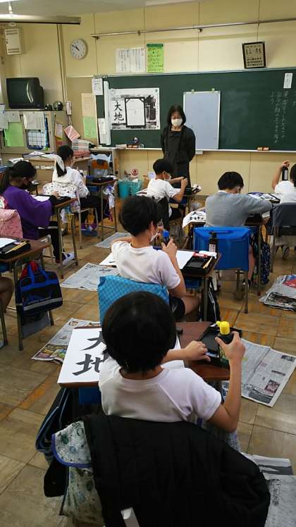 [4年生国語(書写)]「大地」と書いています。漢字どうしの大きさや部分の組み立て方を確かめながら書きます。
