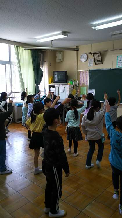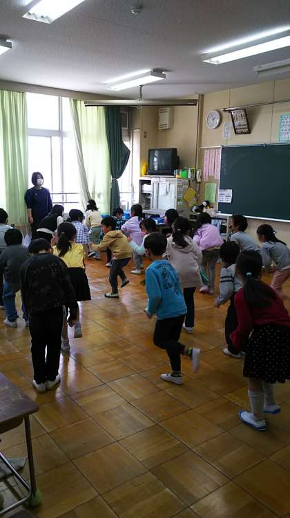 [1年生学活]今年は全校児童が体育館に集まることをやめて、各学年ごと順に体育館へ行き、6年生に出し物をしたりプレゼントを渡したりする形にしました。1年生もみんなで決めたセリフを覚えていきます。