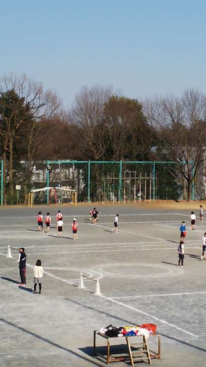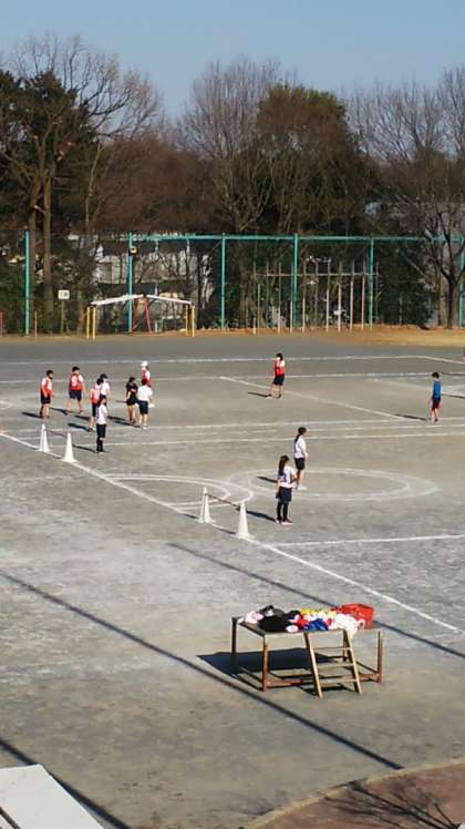 [5年生体育]コートを分けてみんながボールに触る機会を増やしています。それでも校庭が広いので、1コートが十分な広さです。