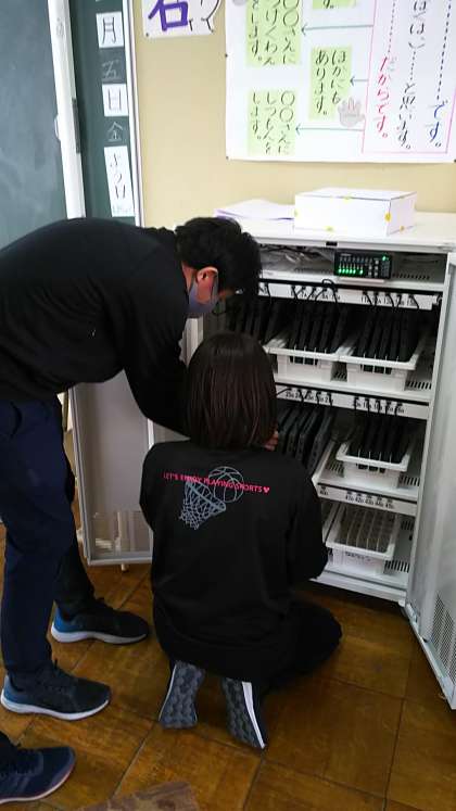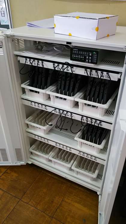 文科省GIGAスクール構想による児童一人一台端末がいよいよ本日、本校にも届きました。早速各教室の充電保管庫に収納されました。