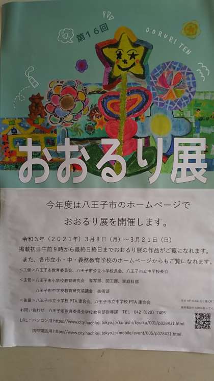 「おおるり展」ですが、八王子市のホームページからもご覧いただくことができます。八王子市のホームページトップ→くらしの情報→教育・生涯学習・スポーツ→教育委員会からのお知らせ→八王子市立小中義務教育学校合同作品展第16回「おおるり展 」から市内全校の作品がご覧いただけます。