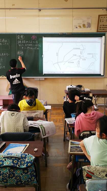 [3年生社会]JR中央線・横浜線・八高線、京王線・京王高尾線そして我らの京王相模原線。八王子にはたくさんの鉄道があります。昔の中央線が蒸気機関車だった頃の写真を見て「うわあ、きかんしゃトー○スみたい!」という子供たちがかわいらしかったです。