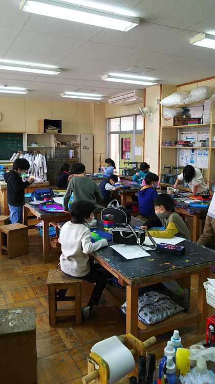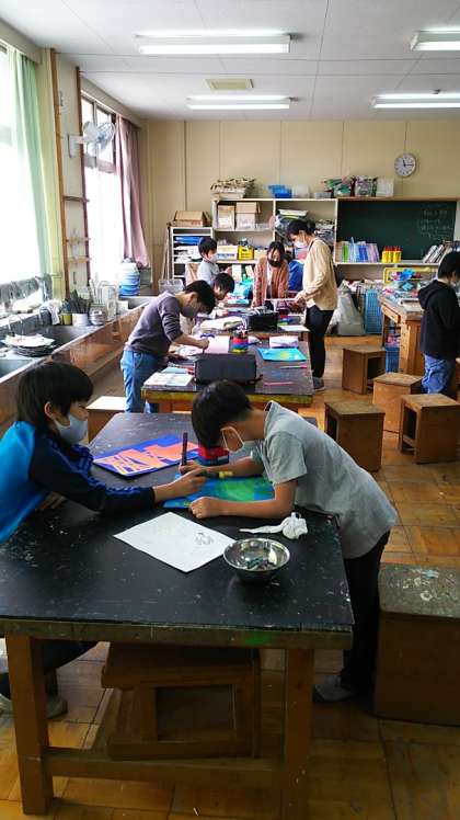 [4年生図工]平面作品「にじ色の物語」の仕上げです。グラデーションの効果をうまく使いながらイメージをふくらませています。