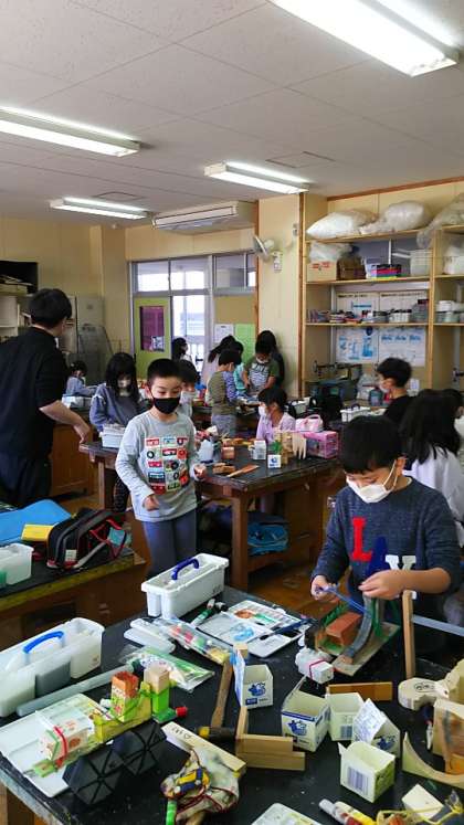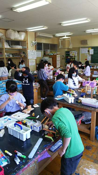 [3年生図工]「くぎうちトントン」の仕上げです。木を固定して形を完成させます。飾り付けをし、色を塗って仕上げます。