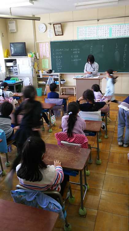 [1年生学活]学期末のお楽しみ会を計画しているようです。仕事の分担をしています。名前の磁石を貼るので先生が「配り係さん」と呼ぶと、係が素早く駆けつけます。