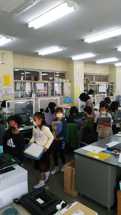 [2年生生活]次に職員室に行きます。副校長先生がお話してくれています。いろんな先生たちも声かけています。