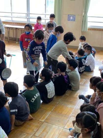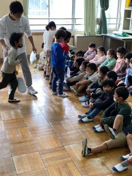 入場の前に、2年生から1年生へ、全校児童で作ったペンダントを首にかけてあげました。