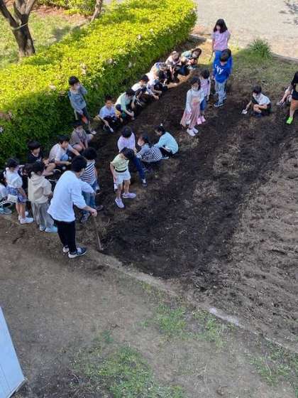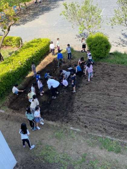 生活科で野菜を育てます。そのために、畑に畝をつくっているところです。事前に主事さんが一日がかりで耕してくれたおかげで、ふかふかの畑に苗を植えることができます。