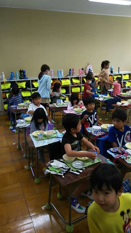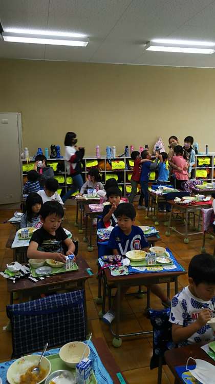 [1年生給食]1年生の教室に6年生たちがやってきました。給食の片付けを手伝ってくれるのです。1年生たちは大喜びです。