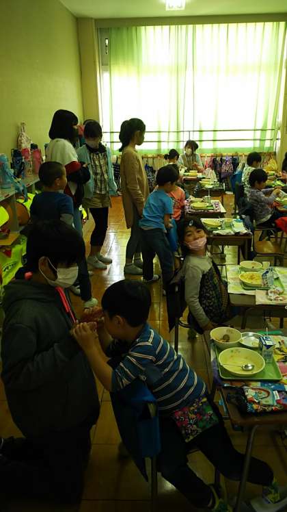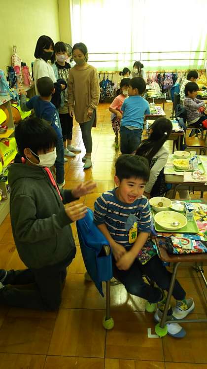 [1年生給食]1年生たちは優しい6年生が大好きです。とてもいい光景です。そろそろ「ごちそうさま」の時間です。