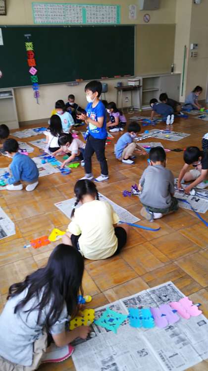 [1年生図工]色紙を折ってから切り、開くと不思議な模様になります。それを紙テープに糊付けしていきます。向きや色の並びを考えながら作ります。