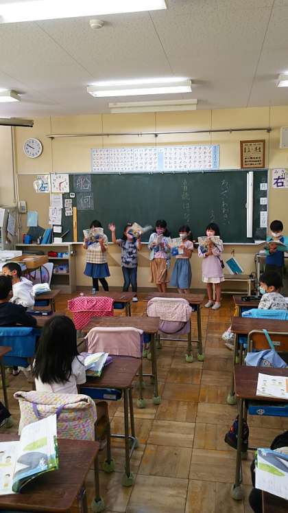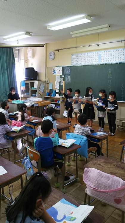 [2年生国語]各班ごとに身振り手振りを工夫しながら音読しています。