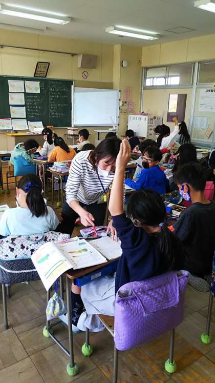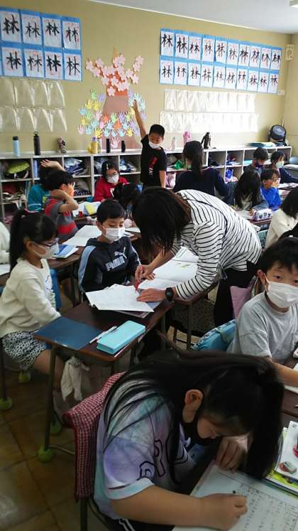 [4年生社会]東京都は、西から東に向かって土地が低くなっていることが分かりました。授業の振り返りをノートに書きます。先生がすぐに読んで丸をつけていきます。