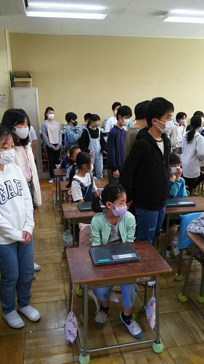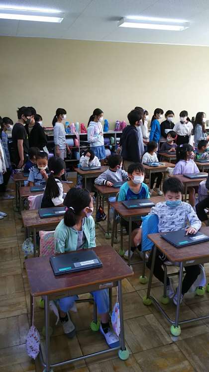 [2年生6年生学活]ここで6年生が登場です。何と6年生が2年生にパソコンを教える助っ人として来てくれました。心強い。