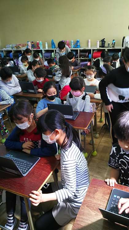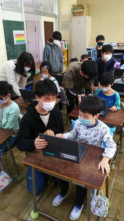 [2年生6年生学活]優しいお姉さん、お兄さんに教えてもらうパソコンの学習です。2年生にとっても6年生にとってもいい体験です。