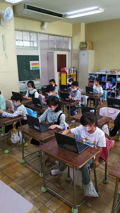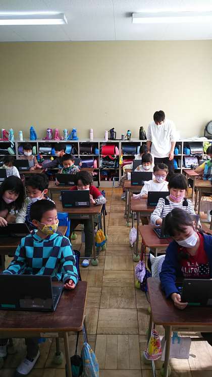[2年生学活]6年生が帰った後で、自分たちで頑張る2年生です。パソコンでお絵かきもできるようです。