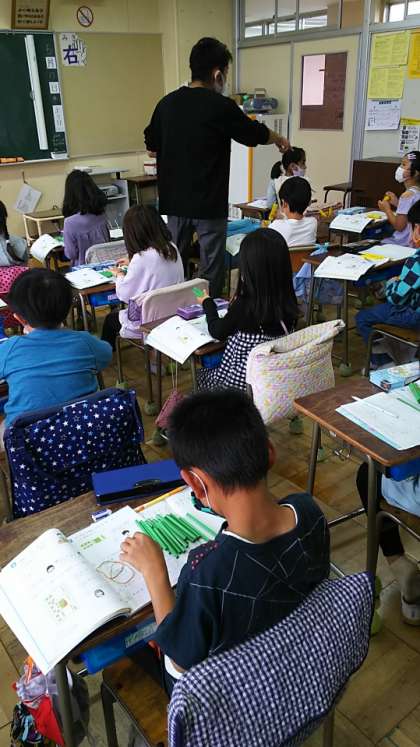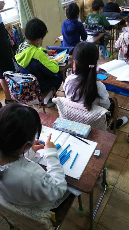 [2年生算数]数え棒を使いながらやり方を考えています。みんなは数え棒を使うことがうれしい様子です。