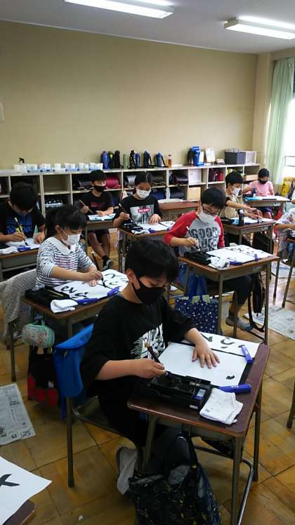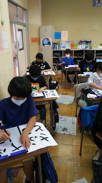 [5年生国語書写]「ふるさと」と書きます。みんな真剣な表情です。ひらがなの曲線は漢字とは違う難しさがありますね。