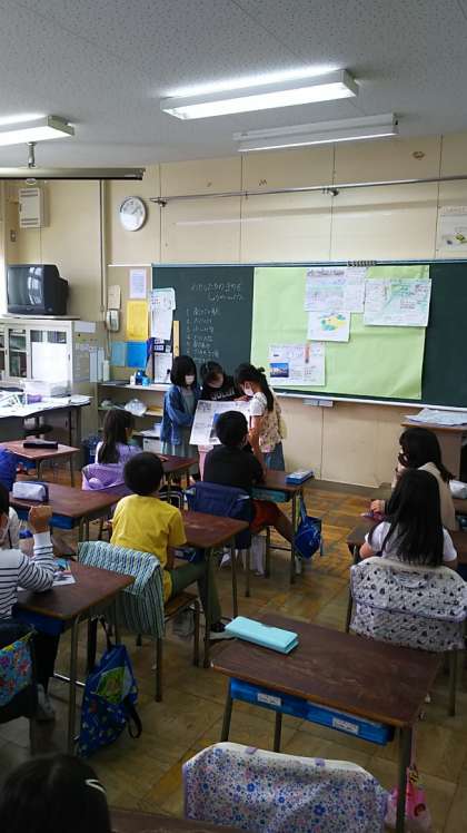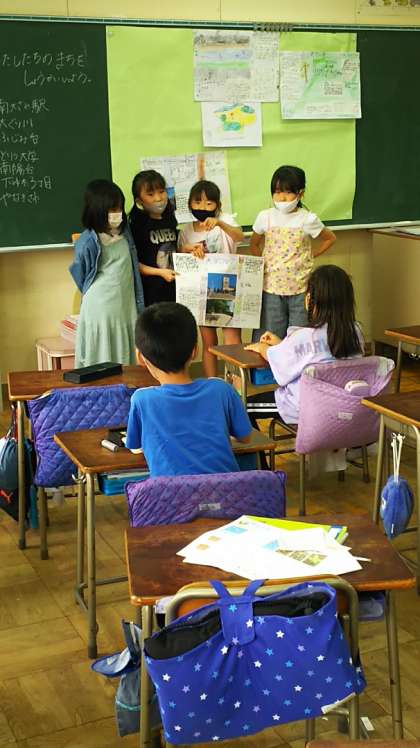 [3年生社会]「まちたんけん」の発表会をしています。「南大さわ駅」「大ぐり川」「ふじみ台」「とりつ大学」「南陽台」「下柚木3丁目」「やなぎさわ」の7グループが順に発表しています。
