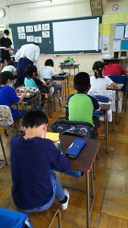 [5年生外国語]最後に振り返りをします。どの教科にも言えることですが、その時間のめあてに対する自分の思いを書き留めていくことが次回へとつながっていきます。