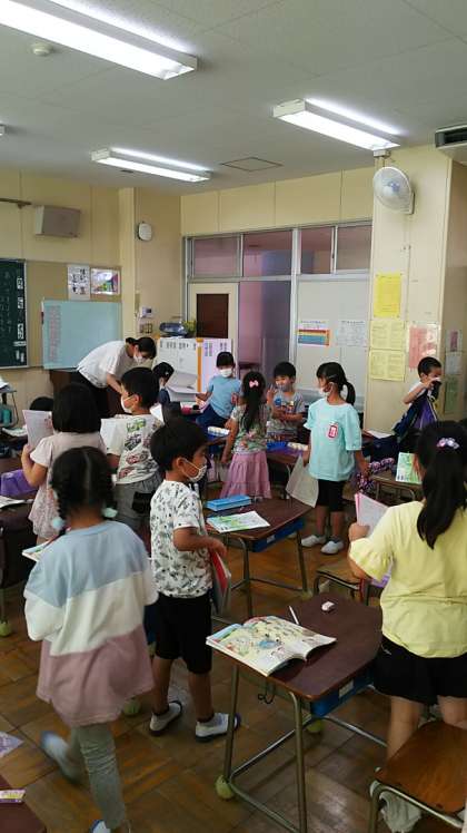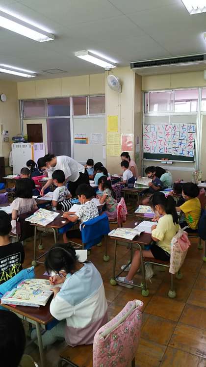 [1年生国語]先生が回ってノートに丸をつけてくれます。しばらくしてみんなでノートを見せ合う時間になりました。