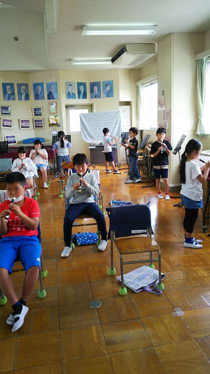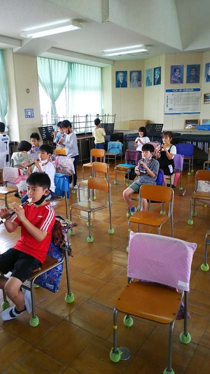 [3年生音楽]グループごとに練習場所を工夫しています。吹き終わったらすぐにマスクを着けます。