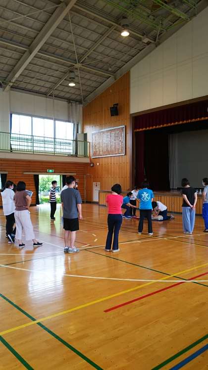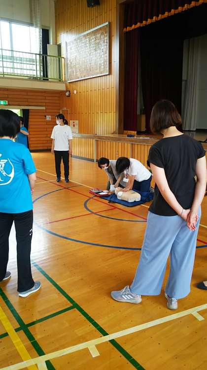 毎年、水泳指導前には必ずAED(自動体外式除細動器)の使い方を復習しています。真剣に取り組んでいる先生たちです。