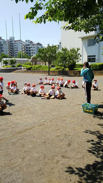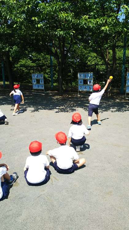 [1年生体育]的をめがけて「えいっ」と投げます。当たると「やったー!」の声があがります。