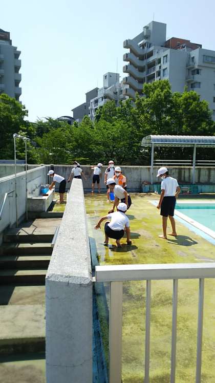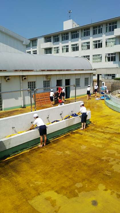 [5年生プール清掃]本当に気持ちよく動いてくれる子供たちです。「校長先生、ほらこんなに汚れが落ちたよ!」とたわしを手に声を掛けてくれます。