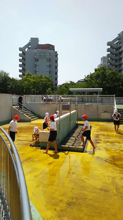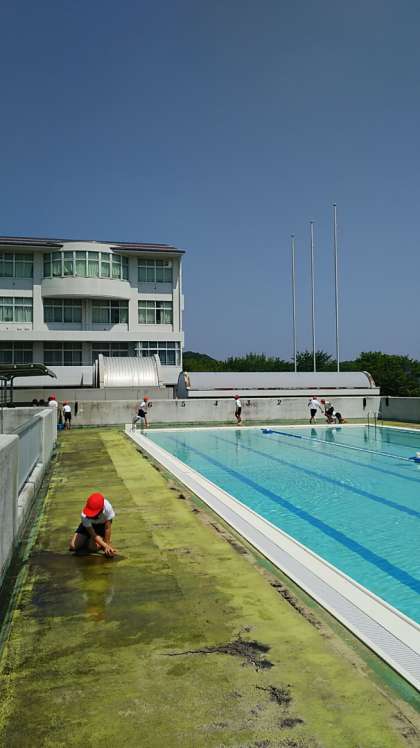 [5年生プール清掃]さあ、きれいな水がみんなを待っています。楽しみですね。今日の放課後には教職員みんなで仕上げの清掃と準備を行います。