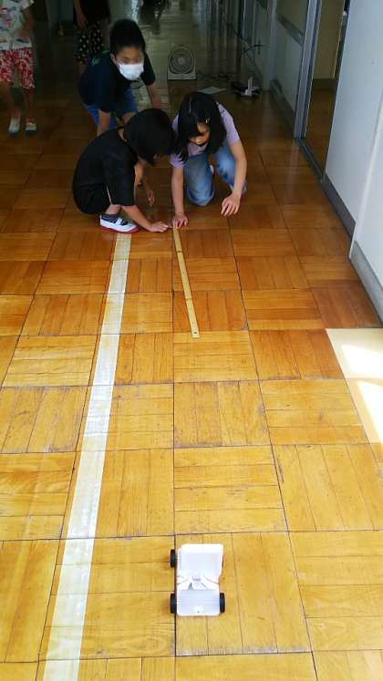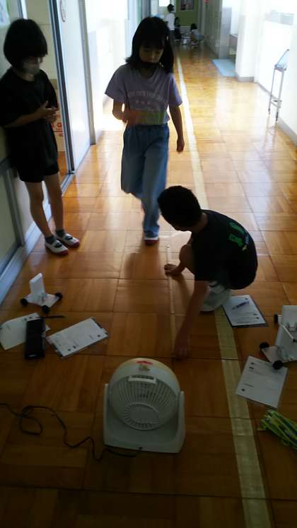[3年生理科]車が動いた長さをものさしで測っています。風の強さによって動いた長さはやっぱり違うようです。
