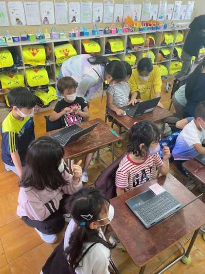 今日の5時間目は、6年生が1年生に、学習用端末の設定をしてあげています。