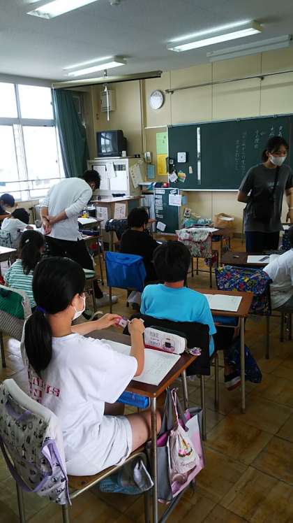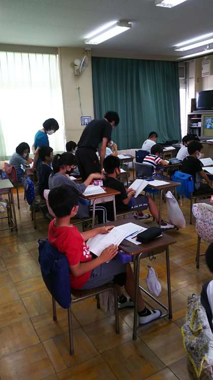 [5年生国語]「言葉と事実」の学習のまとめをノートに書いています。低学年の先生も専科の先生も回りながらアドバイスしていきます。
