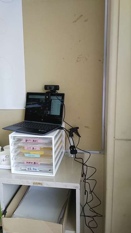 お知らせの通り、今日は学校公開・道徳授業地区公開講座のオンライン公開です。本校初めての取組です。各教室の後ろの棚の上にセットしたパソコンからの配信です。この日のために教室全体が写る広角レンズも準備しました。