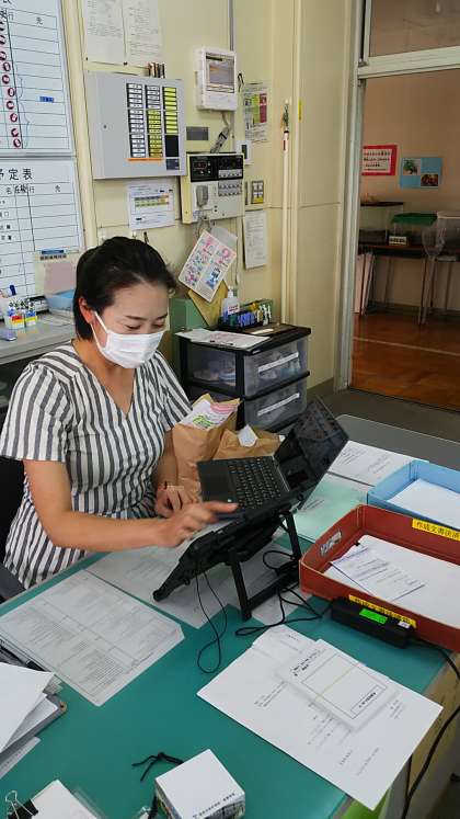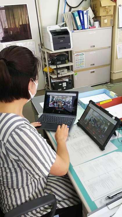 職員室では副校長先生が各教室の写り具合を確認しています。保護者の方からの問い合わせにも対応しています。