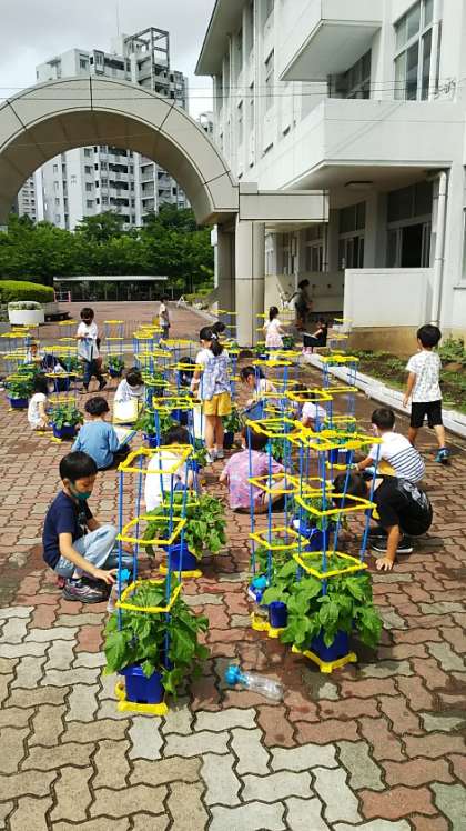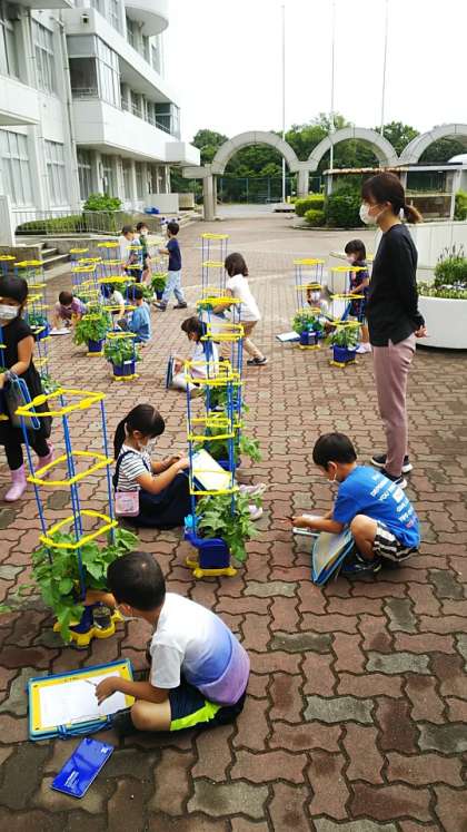 [1年生生活]ここにきてあさがおの成長がスピードアップしています。種は1鉢に6粒ずつ蒔いたそうですが、どの鉢も見事に葉を広げています。