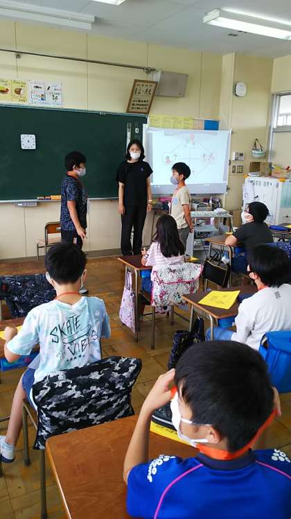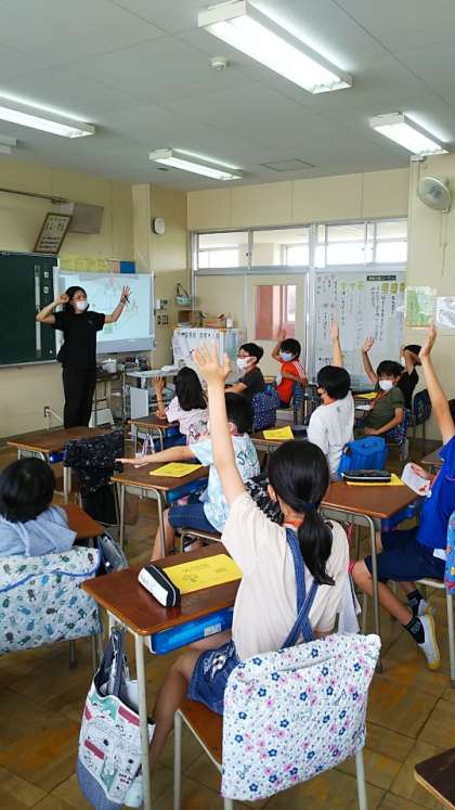 [5年生外国語]先生が「Volunteer!」と呼び掛けると、たくさん手が挙がります。みんなの前で会話を披露することに積極的です。素晴らしい。