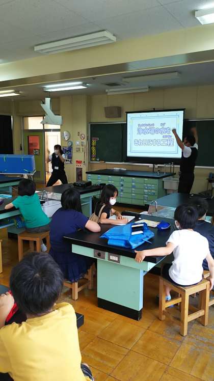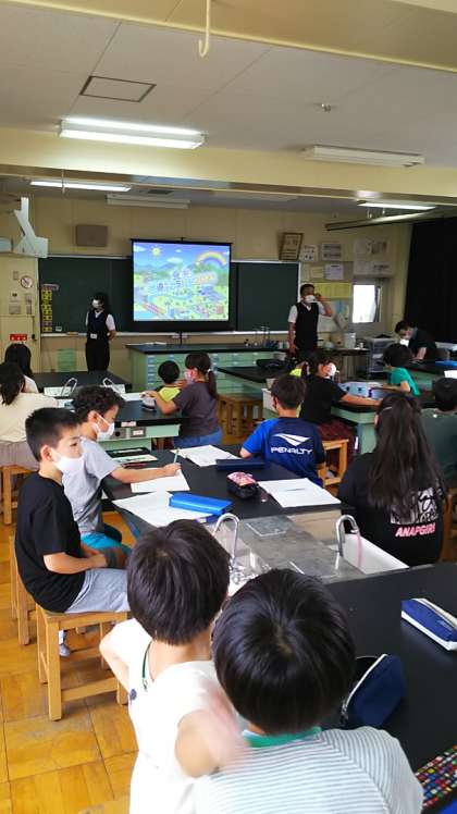 [4年生社会]今日は水道キャラバンの方々を迎えて社会科「水はどこから」の学習です。